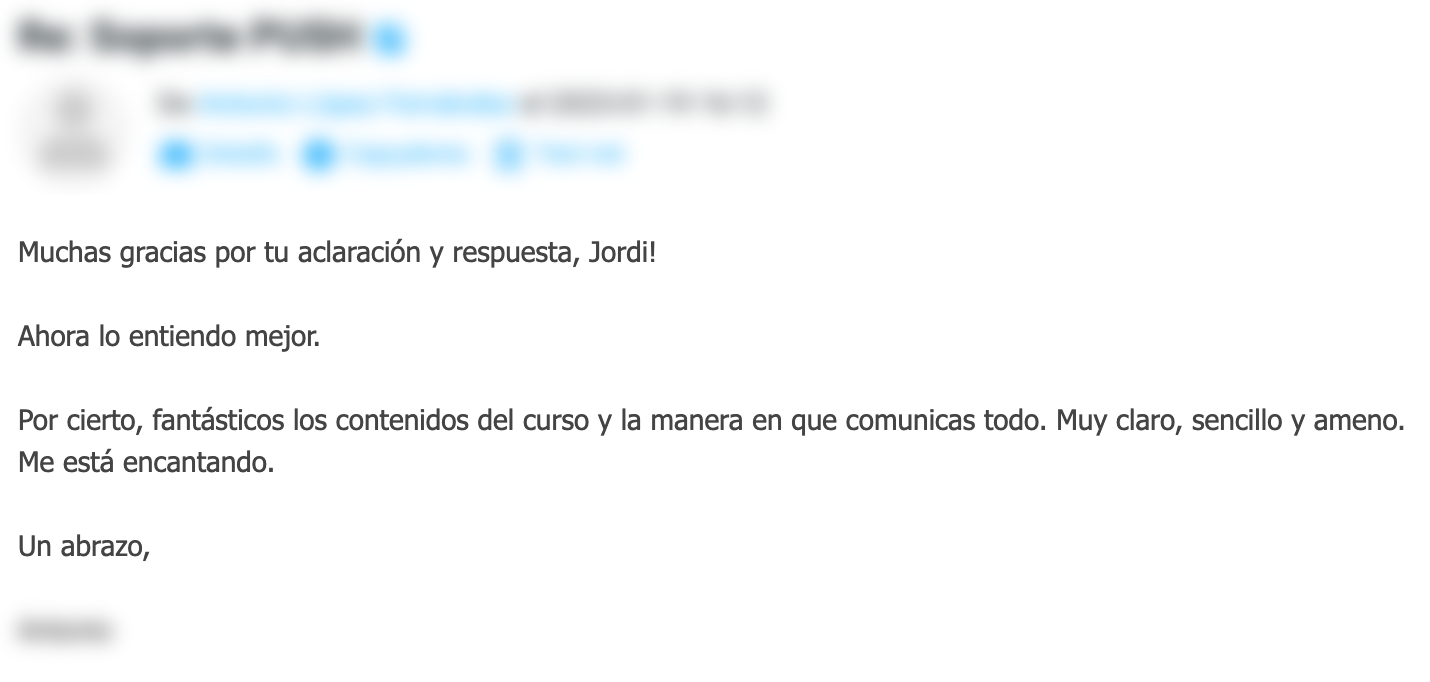 Hay soporte grupal. Cuando compres el curso recibirás acceso a un panel desde el que podrás escuchar las lecciones y enviar preguntas a través de un formulario. El último sábado de cada mes público una lección, en la que contesto las mejores preguntas recibidas durante los últimos 30 días.